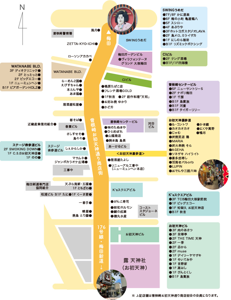 梅田キタ 恋するグルメ商店街 恋物語「曽根崎心中」ゆかりの地 お初天神 露天神社の表参道